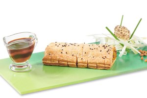 The Vegan & Gluten Free Gourmet Roll is made from Ready Bake's new vegan & gluten free puff pastry, filled with a uniquely seasoned pumpkin, leek, cauliflower, lentil, carrot, corn, and pea filling, topped with sesame seeds.