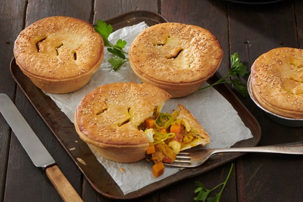 - Once pie shells have thawed, fill each shell with room temperature curry vegetable pie mix.